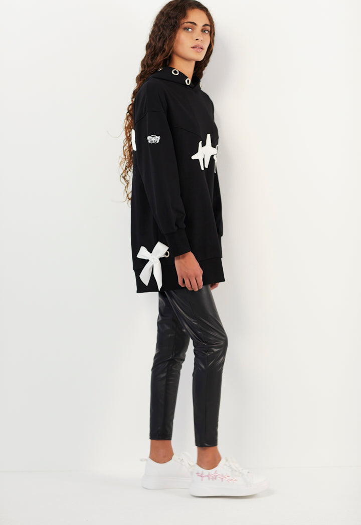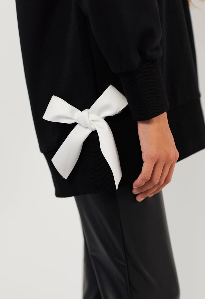 A knitted hoodie that features an embossed design, ribbons and long sleeves.