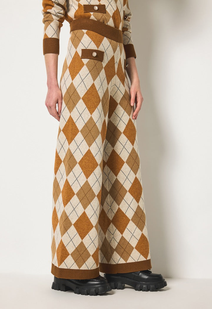 A Pair Of Multicolored Knitted Trousers With Argyle Pattern For Winter Season.