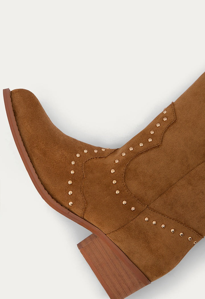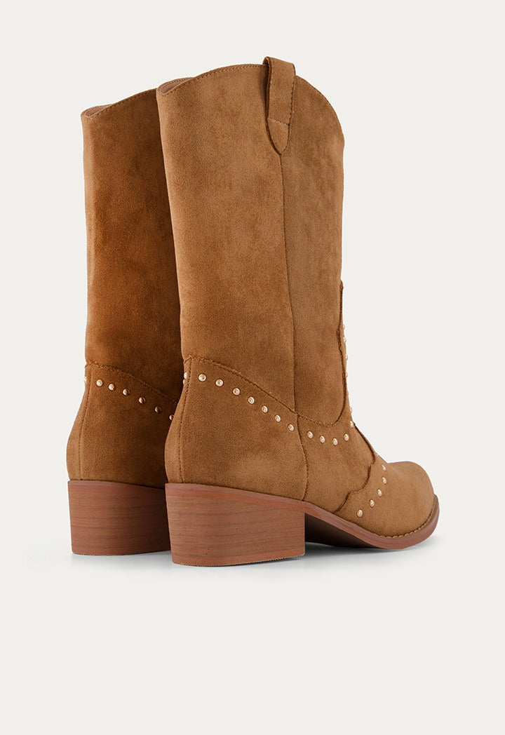A Pair Of Calves Length Suede Boots With Metallic Details And A Block Heel.