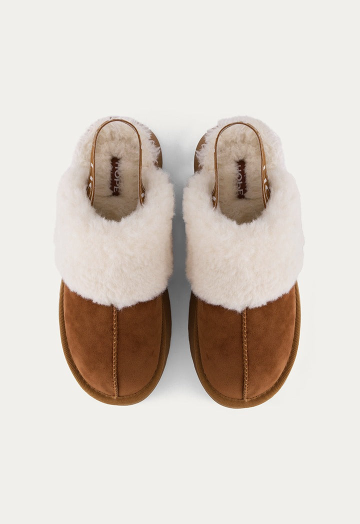 A Pair Of Comfortable Faux Fur Embellished Suede Slippers With An Elastic Monogram Ankle Strap.