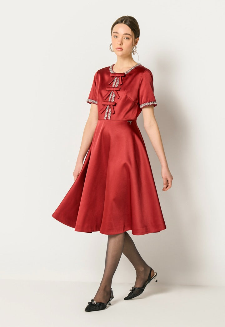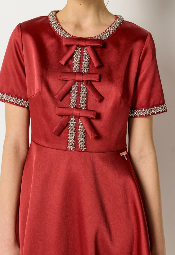 Crystal Trim Ribbon Front Dress Burgundy