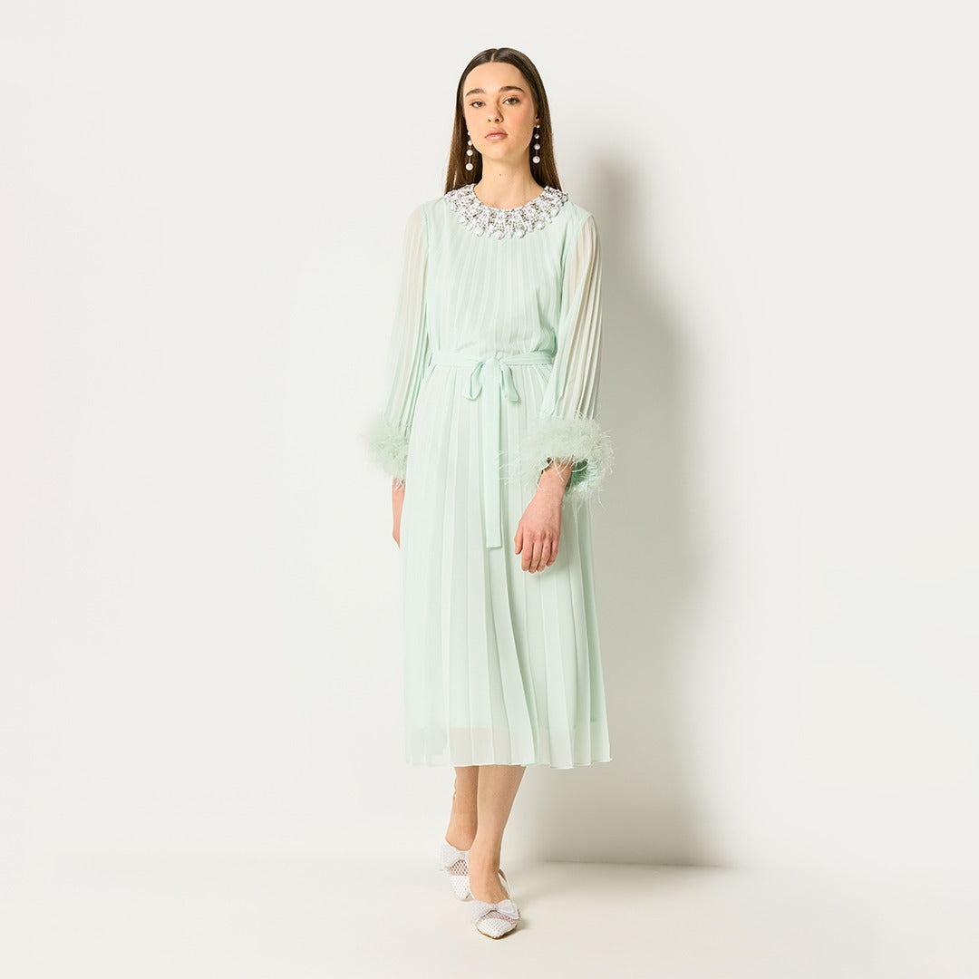 This Maxi Pleated Dress, Embellished With Crystals And Beads Around The Neckline, Is Perfect For Formal Occasions And Parties.