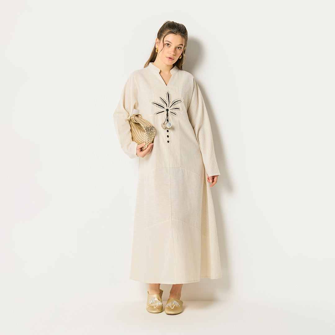 Striped Palm Details Dress Beige