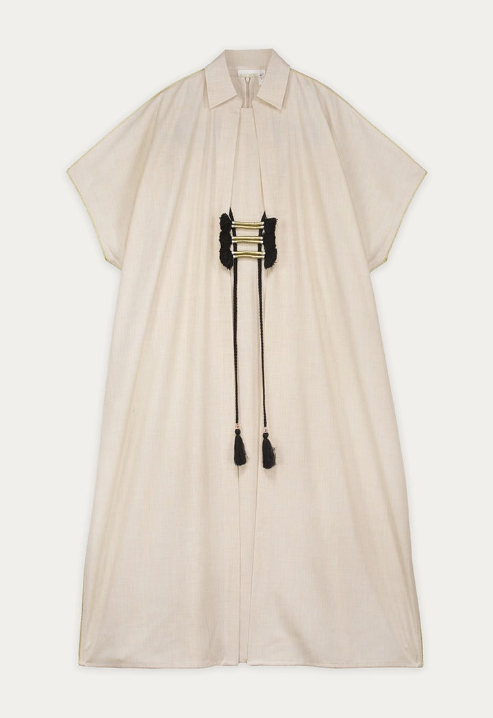 Alight Collared Dress With A Dramatic Cape And Tassel Cords For A Modern Statement Look That Still Feels Easy To Wear.