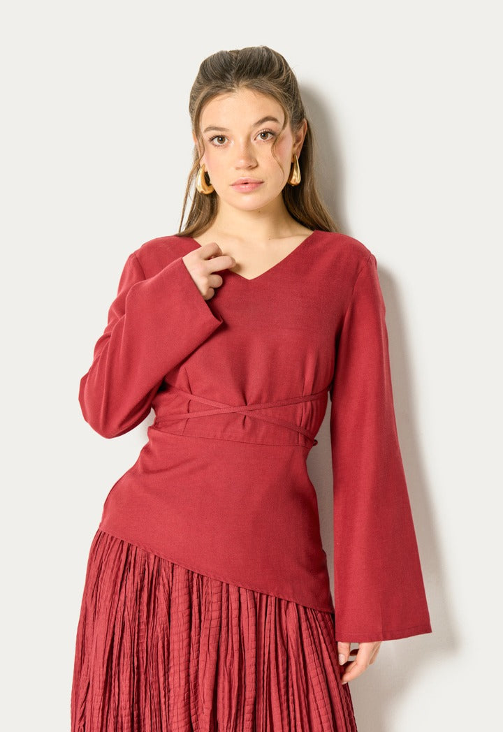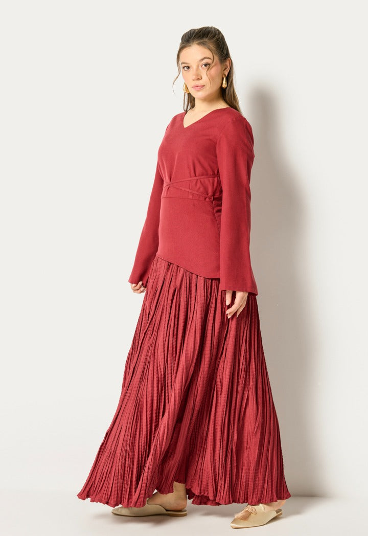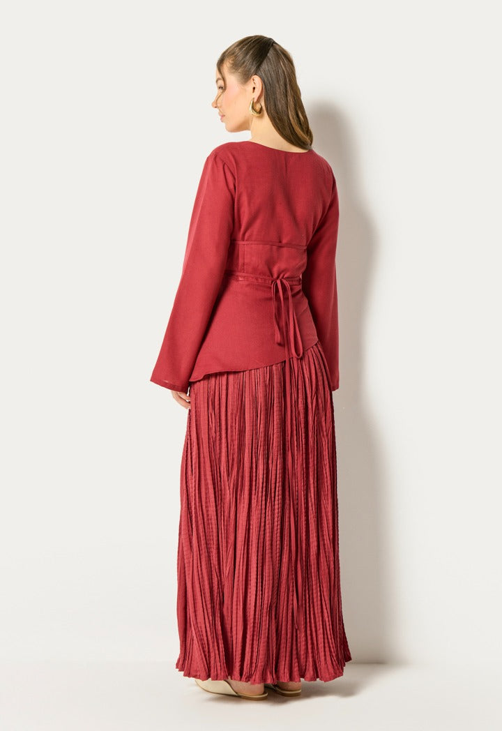 Tie Waist Top And Crinkled Skirt Set (2Pcs) Burgundy