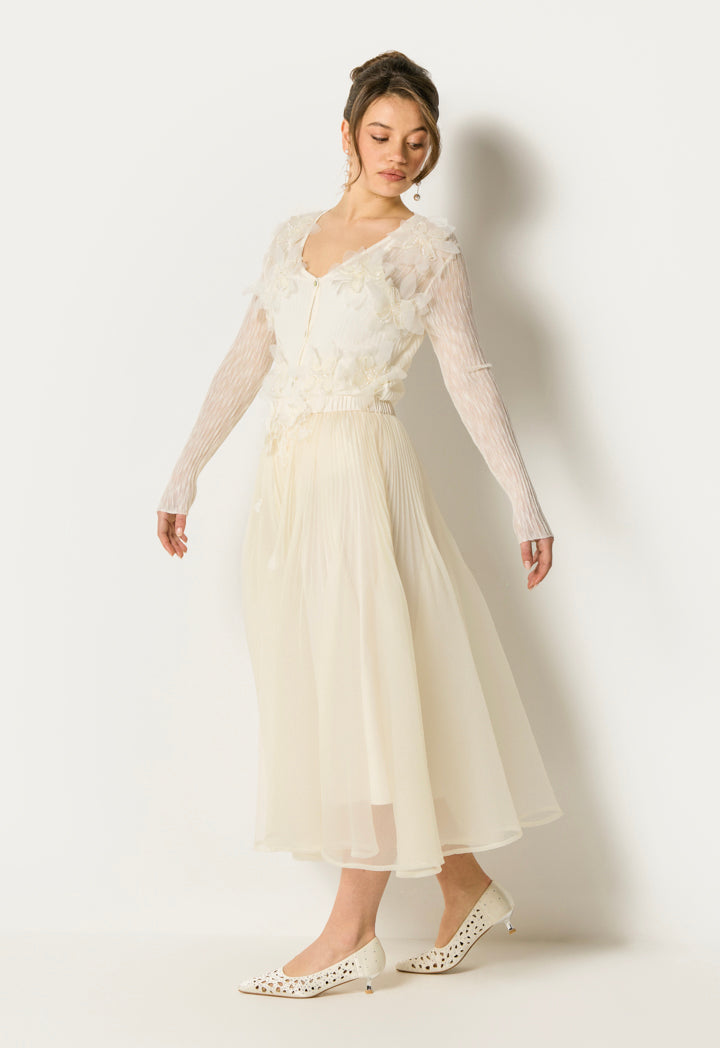Design : Organza, Tortured, Floral Details, Pleated Waist, Flared Hem, Attached Lining