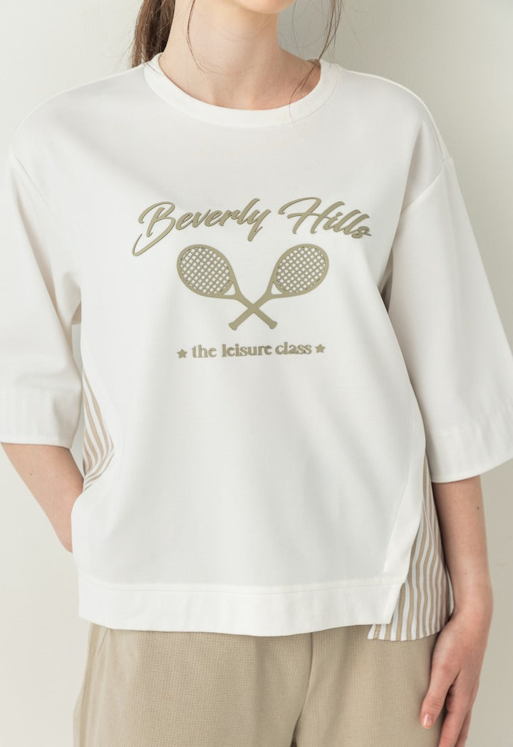 A Short Sleeves T Shirt That Features An Embossed Print And Striped Sides.