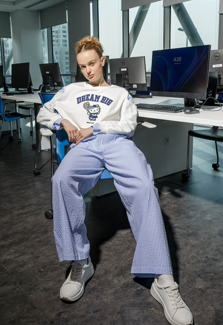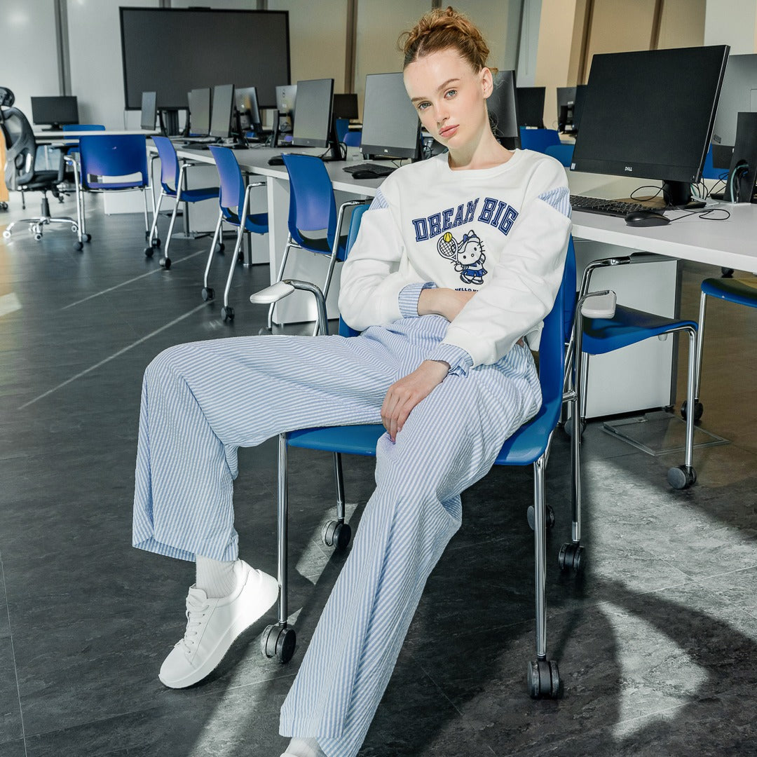 High-Waisted Straight-Leg Pants, Striped With Pockets And A Double Waistband.